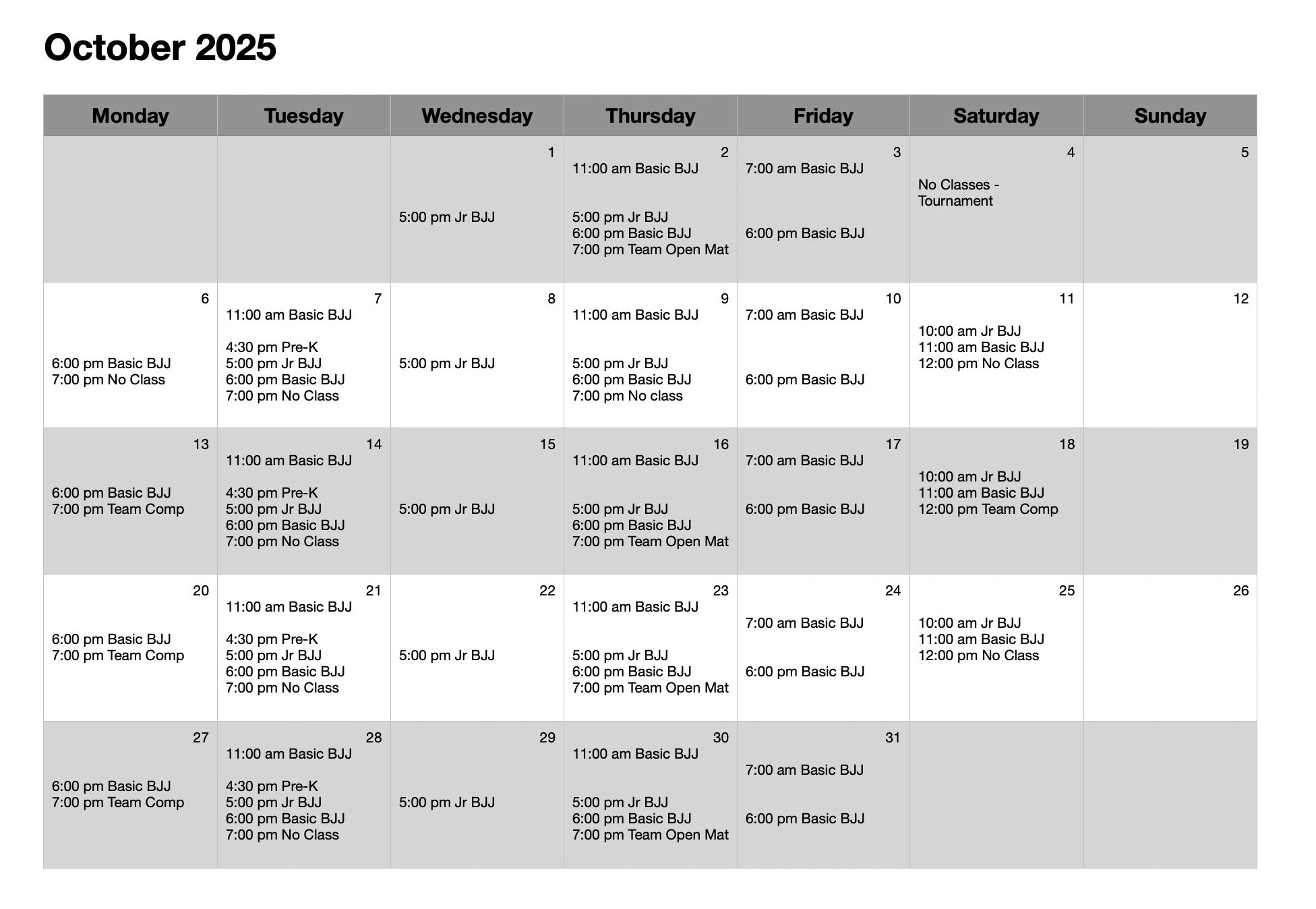 Designed for beginners and advanced alike, review fundamentals and practice the core movements of JiuJitsu.
